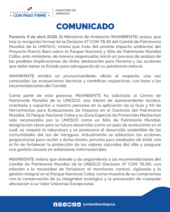 Panamá, 6 de abril 2026. El Ministerio de Ambiente (MiAMBIENTE) aclara, que tras la recepción formal de la Decisión 47 COM 7B.39 del Comité de Patrimonio Mundial de la UNESCO, misma que trata del posible impacto ambiental del Proyecto Puerto Barú sobre el Parque Nacional y Sitio de Patrimonio Mundial Coiba, este ministerio, de manera responsable, inició un proceso de análisis de las posibles implicaciones de dicha declaración para Panamá y las acciones que debe tomar el Estado para salvaguarda de su patrimonio natural.