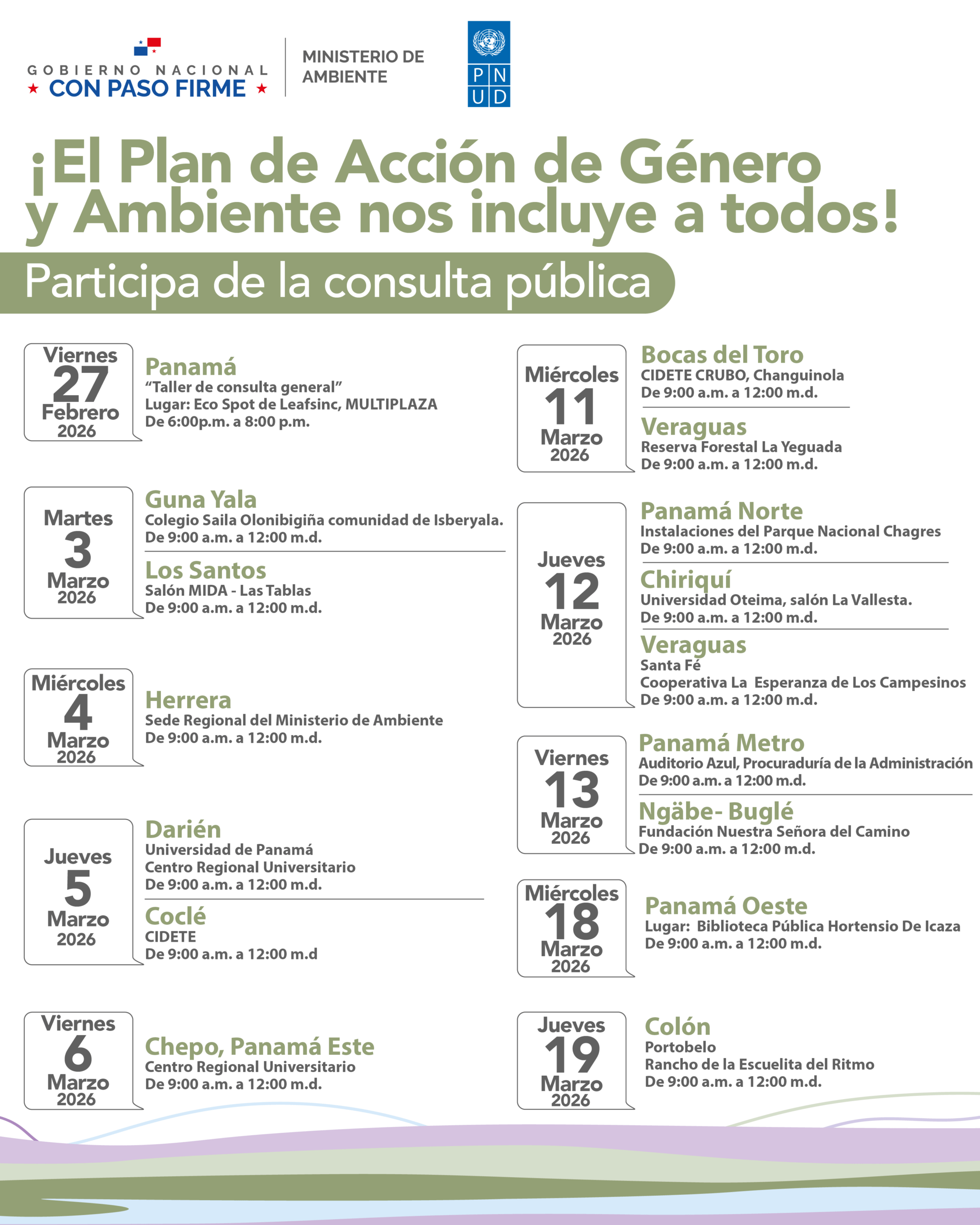 Consulta Pública sobre documento borrador «Plan de Acción de Género y Ambiente – Pacto de Panamá con la Naturaleza»sysadmin | Publicado el 23 febrero, 2026 | Documento Borrador - Propuesta de Plan de Acción de Género y Ambiente 1 archivo(s) 1.09 MB Descargar Documento de Apoyo Resumen Conceptos Clave - PAGA Panamá 1 archivo(s) 201.23 KB Descargar Documento de Apoyo Resumen Ejecutivo 1 archivo(s) 228.39 KB Descargar Post Views: 571 Navegación por entradas ← Entrada anteriorEntrada siguiente →