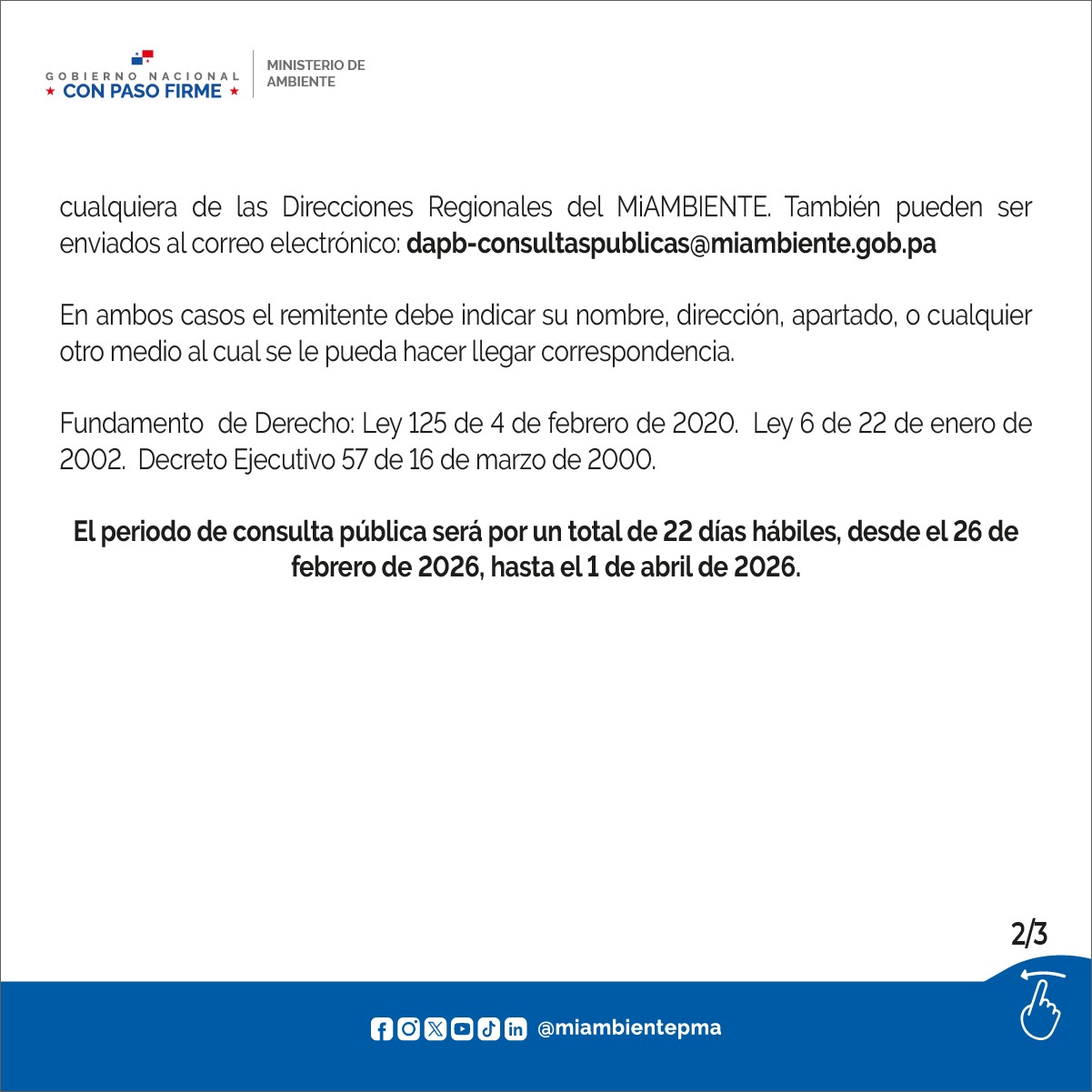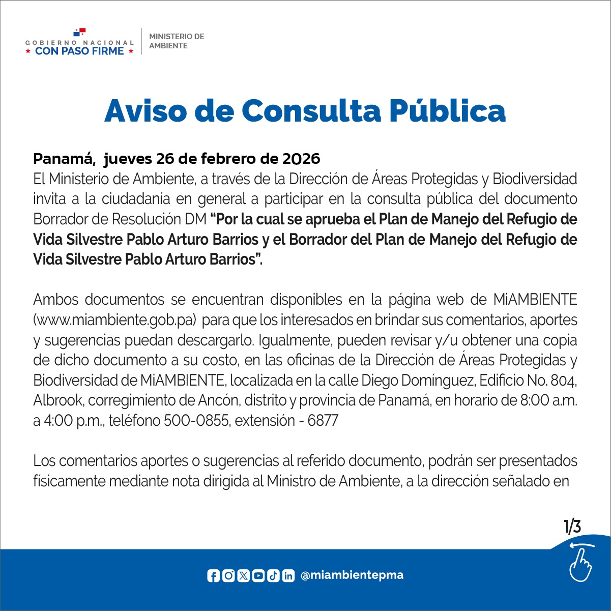 Consulta Pública sobre el Borrador de Resolución donde se aprueba el Plan de Manejo del RVSPABsysadmin | Publicado el 24 febrero, 2026 | Plan de Manejo Refugio de Vida Silvestre Pablo Arturo Barrios 1 archivo(s) 13.22 MB Descargar Borrador de Resolución - Refugio de Vida Silvestre Pablo Arturo Barrios 1 archivo(s) 109.73 KB Descargar Post Views: 332 Navegación por entradas ← Entrada anteriorEntrada siguiente →