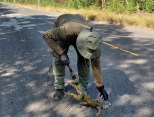 Panamá Oeste, 10 de abril de 2026. Durante un patrullaje de control y vigilancia en la vía que conduce hacia Punta Chame, guardaparques del Área Protegida Manglares de la Bahía de Chame del Ministerio de Ambiente, dirección regional de Panamá Oeste, detectaron dos ejemplares de iguana verde, muerta en la vía, por lo que se presume que fue atropellada, los cuales fueron retirados de la carretera para evitar riesgos a los conductores y prevenir afectaciones al entorno.