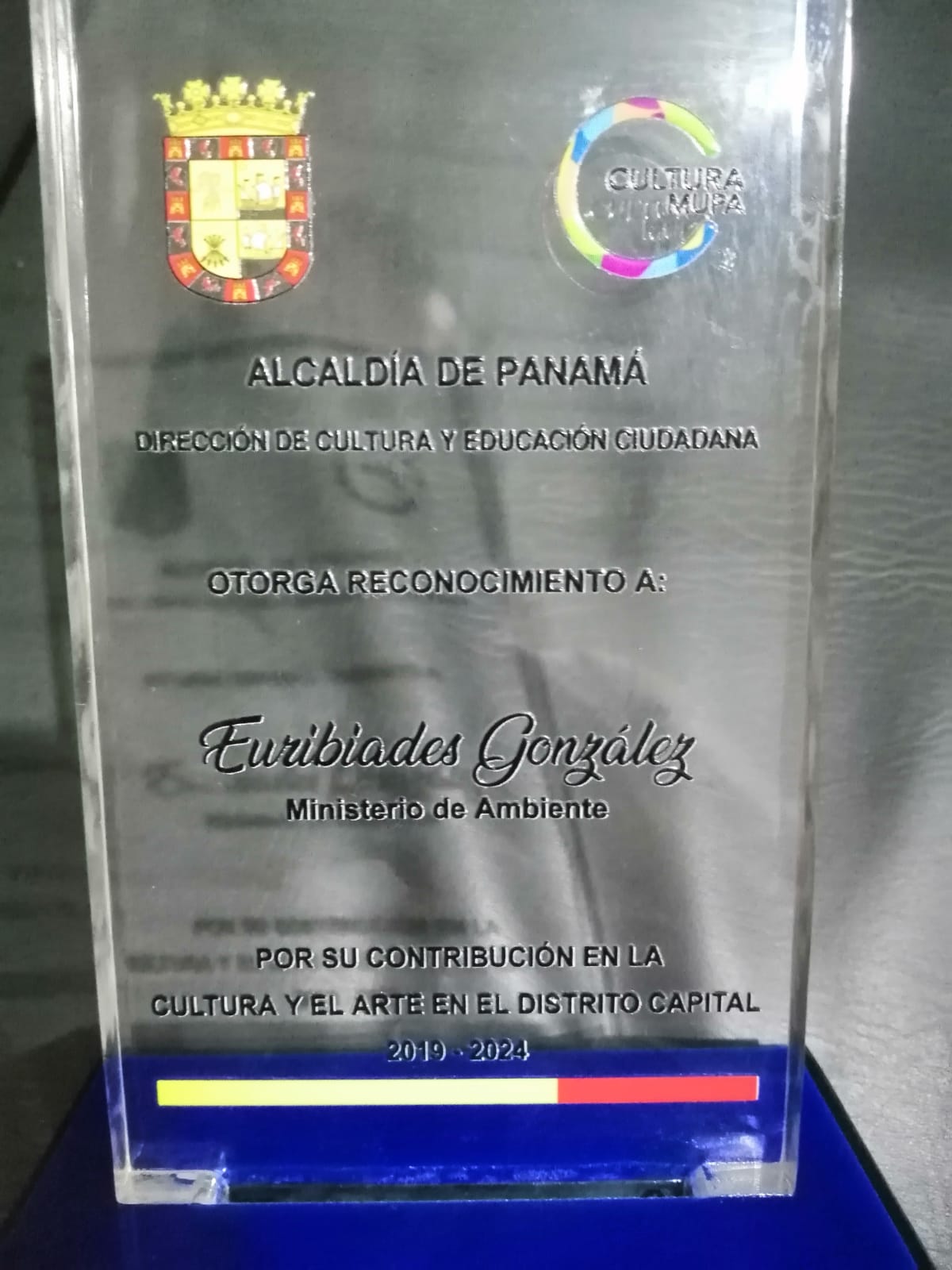 Este reconocimiento se da por la valiosa colaboración en las actividades culturales y artísticas en la ciudad de Panamá.