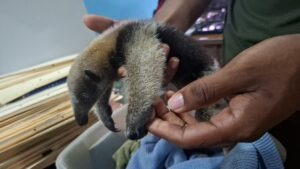 Una familia, demostrando su compromiso con la conservación de la vida silvestre, entregó a técnicos de la sección de Áreas Protegidas y Biodiversidad una cría de oso hormiguero (Tamandua tetradactyla), que fue encontrada en el patio de su residencia, donde también observaron a la madre muerta del ejemplar en el área, lo que generó preocupación por la seguridad del pequeño animal.