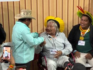 El encuentro “Bosques en pie, acuerdos en la práctica: Diálogo entre el jefe Raoni y los negociadores climáticos” se realizó en el Pabellón de Fondos Climáticos, organizado por Panamá en coordinación con el Instituto Raoni, Nature Summit y aliados internacionales. El evento permitió que la voz del reconocido líder Kayapó fuera escuchada directamente por negociadores involucrados en la implementación del Acuerdo de París. La conversación colocó en el centro la importancia de mantener los bosques en pie, de liderar una gobernanza climática basada en derechos y de conectar el conocimiento ancestral con las decisiones globales que se toman en la COP.