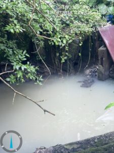 Durante la inspección, el equipo técnico de MiAMBIENTE constató una descarga significativa de aguas residuales que fluía desde un cajón pluvial de concreto de 24 pulgadas de diámetro hacia la quebrada. Tras un recorrido por la zona, incluyendo áreas de vegetación densa y la vía principal de Pedregal, se identificó una cámara de inspección en carga, asociada a una ruptura de la línea sanitaria ubicada por debajo de residencias y comercios del sector, lo que generó la descarga directa al cuerpo de agua.