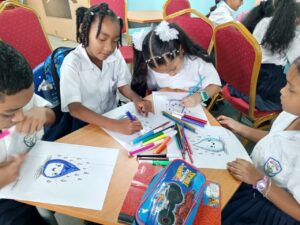 Como parte de la jornada educativa, los estudiantes también conocieron a Moana, el manatí inflable de MiAMBIENTE, un personaje utilizado en actividades de educación ambiental para promover la protección de los recursos naturales. Asimismo, participaron en una zona de colorear y elaboraron manualidades en forma de gota de agua, resaltando el eslogan “Gota a gota, el agua se agota”, reforzando de manera creativa el mensaje de conservación.