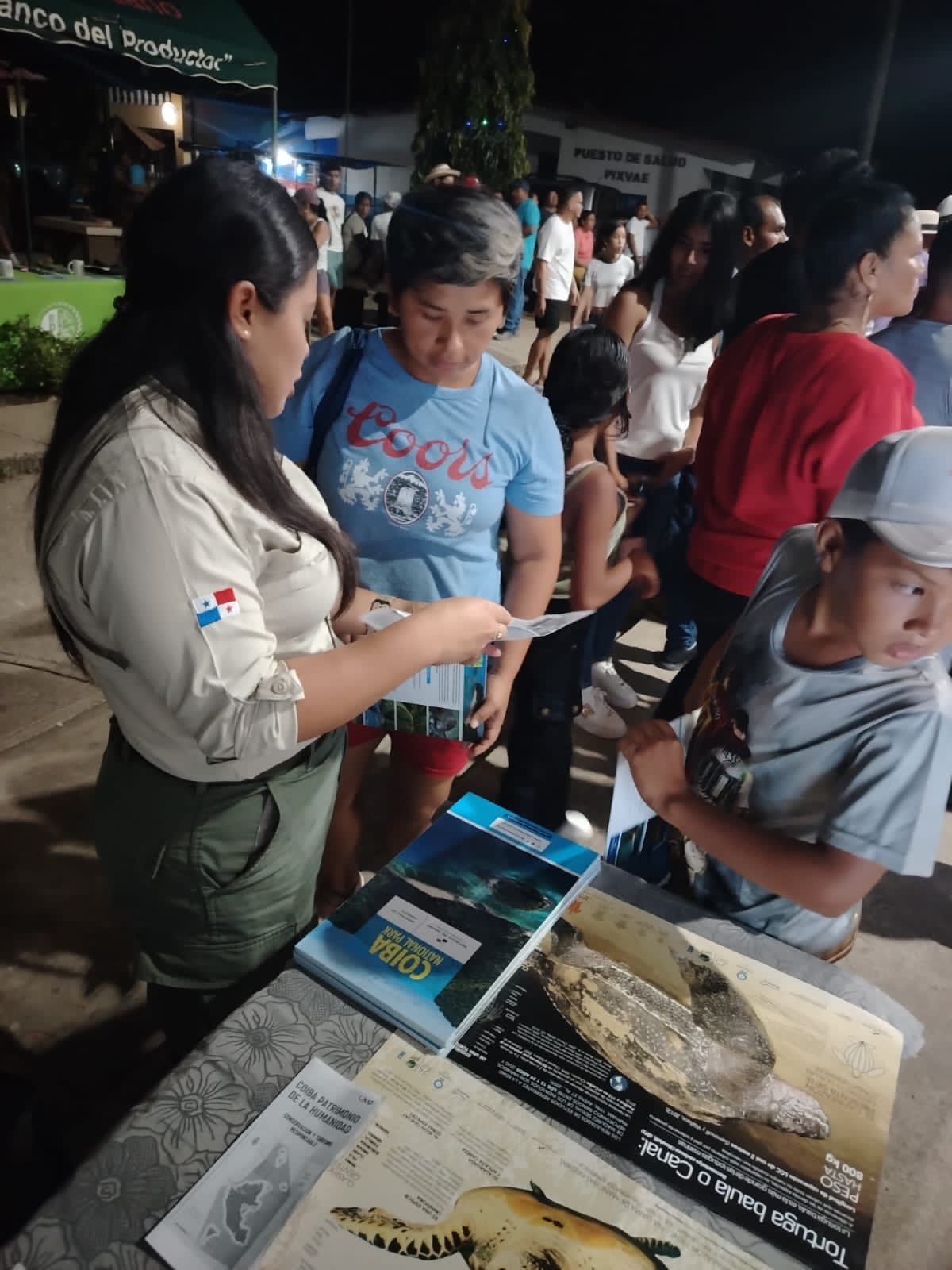 Pixvae, Veraguas,16 de enero de 2025 – El equipo del Parque Nacional Coiba (PNC) fue invitado la noche del miércoles 15 de enero a la inauguración de la IX Feria Ecoturística de Pixvae, un espacio de encuentro comunitario y cultural en el que guardaparques del Sistema Nacional de Áreas Protegidas (SINAP) del Ministerio de Ambiente (MiAMBIENTE), que custodian esta área protegida promovieron la conservación de los recursos naturales del país. Durante la jornada entregaron a los visitantes material educativo sobre la importancia ecológica, cultural y turística del Parque Nacional Coiba, destacando los esfuerzos de conservación que se desarrollan en esta