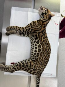 Panamá, 10 de marzo de 2026 – Un ocelote (Leopardus pardalis) macho fue atropellado en la comunidad de Gamboa y trasladado a la Clínica Veterinaria de Fauna Silvestre del Ministerio de Ambiente (MiAMBIENTE), donde los médicos veterinarios realizaron la evaluación correspondiente, determinando su muerte.