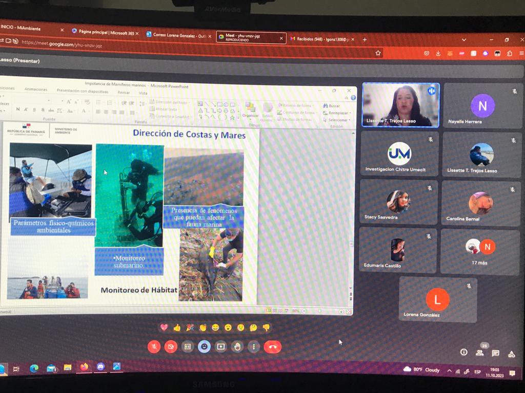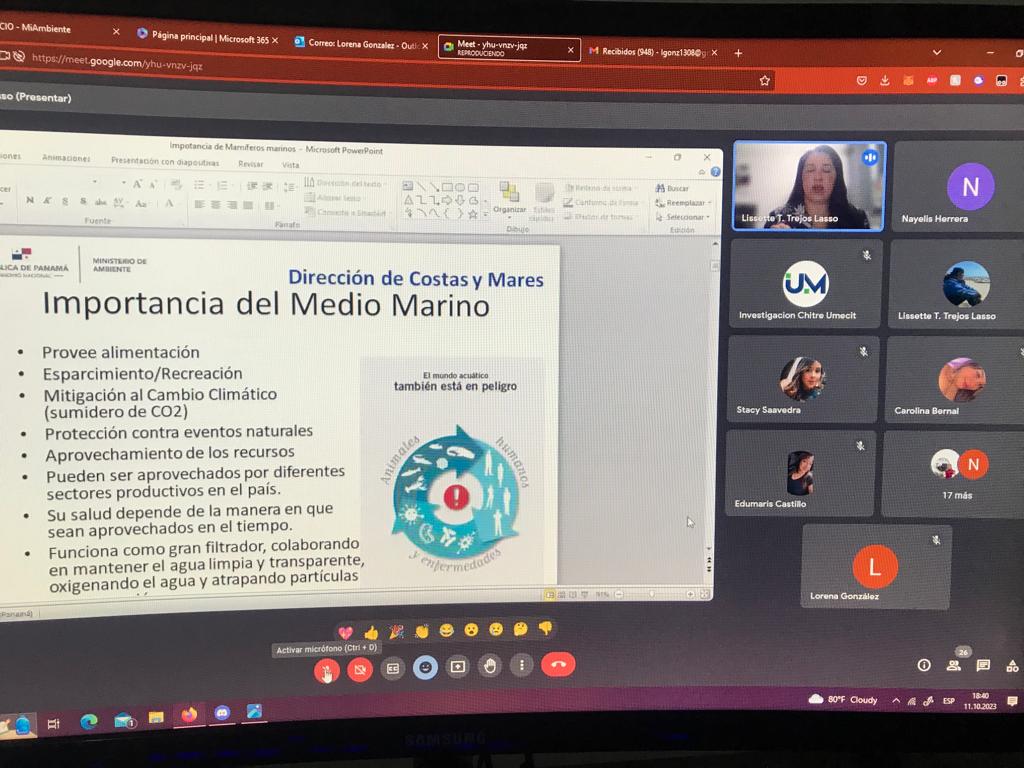 La Dirección Regional del Ministerio de Ambiente (MiAMBIENTE), de Herrera en conjunto con la Universidad Metropolitana de Educación, Ciencia y Tecnología (UMECIT), llevaron a cabo la charla virtual sobre “Importancia de los mamíferos marinos en el ambiente marino costero” a cargo de la médica veterinaria, Lissette Trejos Lasso de la dirección Nacional de Costas y Mares.
