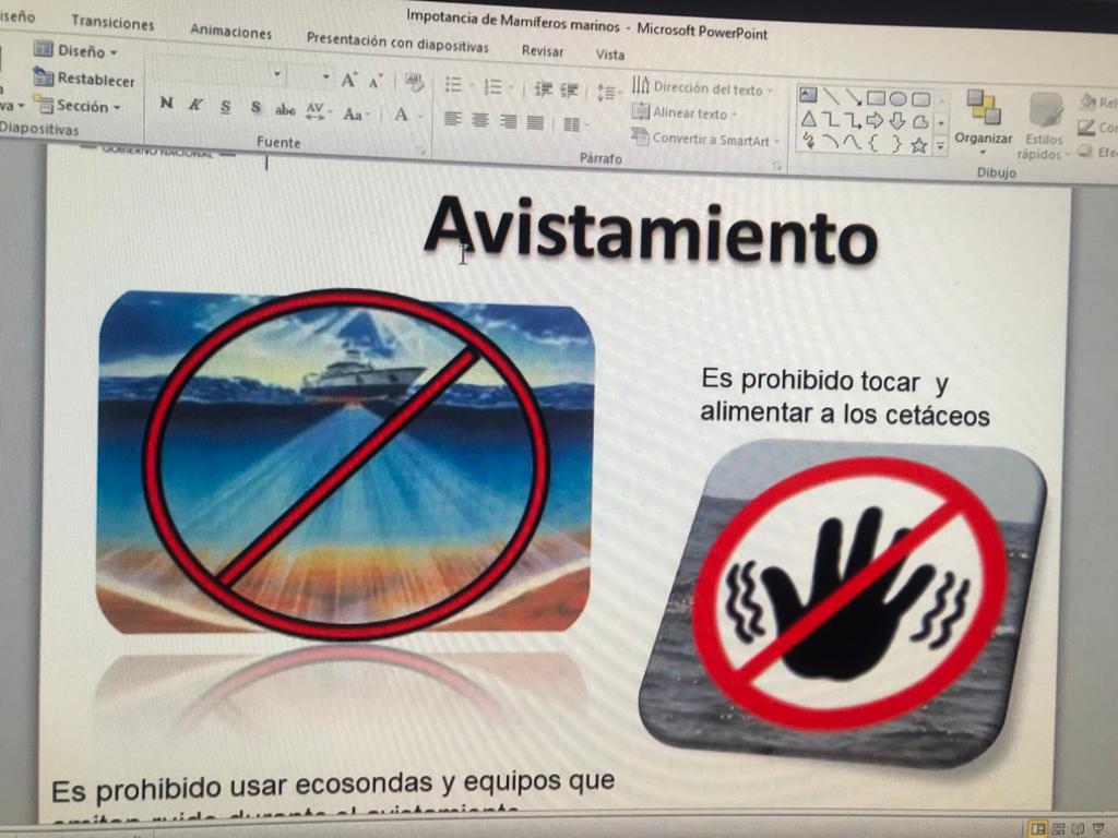 La exposición, inició con la presentación de los bienes y servicios ambientales que proveen estas especies, el papel que desempeñan para desacelerar los efectos negativos del cambio climático, su rol en la regulación de la cadena trófica, los beneficios económicos en el avistamiento responsable de cetáceos (ballenas y delfines), así como todas las normas que requieren cumplirse en su avistamiento.