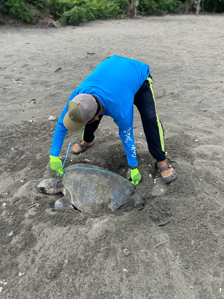 Wilfredo Poveda, biólogo encargado del área Protegida Playa La Marinera, señala que se ha realizado el marcaje externo a tortugas para observar patrones de reanidación en las próximas arribadas y en la toma de datos biométricos para conocer la talla de las tortugas que anidan en el área protegida.